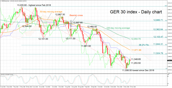 The Germany 30 index gained ground after touching a two-year nadir of 11,006.50 last week and is currently trading roughly 300 points above the aforementioned bottom.