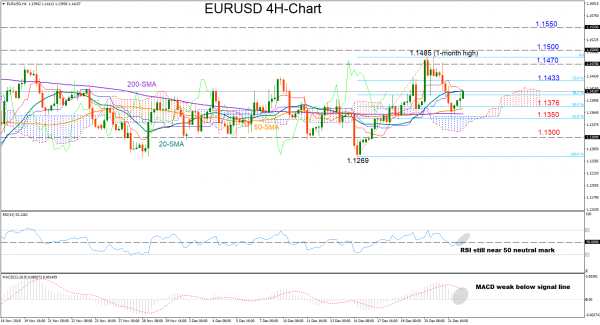 EURUSD changed direction to the upside after touching the upper surface of the Ichimoku cloud in the four-hour chart but stronger evidence is needed to support that the recovery could hold for longer, as the RSI is still close to its 50-neutral mark. The MACD has also yet to give positive signs, as the indicator continues to fluctuate far below its red signal line.