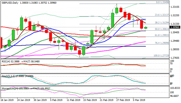 Cable consolidates above strong supports at 1.3050 zone (converged 20/30SMA’s) approached on Thursday’s bearish acceleration through pivotal 1.3129 Fibo support (38.2% of 1.2772/1.3349 rally) that resulted in daily fall of 0.65%.