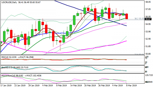 WTI oil price fell over 1% on Friday as weak China’s data (Feb exports -20.7% vs -4.8% f/c, the biggest drop in three years) soured sentiment, adding to renewed fears about global growth slowdown that would likely impact oil demand and pressure oil prices. Fresh weakness pressures the lower boundary of past three-day congestion, when oil prices showed indecision on strong rejections at both sides. Negative signals are developing on daily chart, as indicators turn south and momentum is entering negative territory. Close below cracked 20SMA ($55.84) would add to negative signal, with extension below 30SMA ($55.11) which reinforces the floor of short-term $55.01/$57.85) to signal reversal. Strong US jobs data today would boost the dollar and add to negative outlook for the oil prices.
