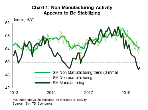 The ISM non-manufacturing report, on the other hand, ushered in a bit of optimism. The headline index followed its manufacturing counterpart higher in October, with the improvement broad-based across the subcomponents. While a bit better than expected, the October uptick was not large enough to offset the decline in the month prior. As such, instead of a major strengthening in the pace of expansion, the recent trend is more indicative of a stabilization in activity (Chart 1).