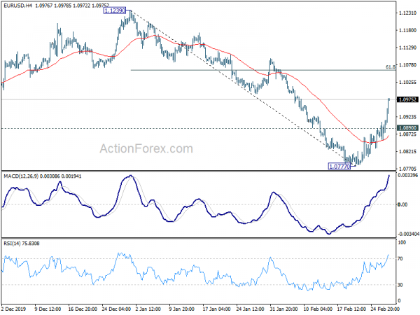 EUR/USD’s rebound from 1.0777 extends further to as high as 1.0978 today. The strength suggests that it’s corrective whole fall from 1.1239 to 1.0777. Intraday bias remains on the upside for 61.8% retracement of 1.1239 to 1.0777 at 1.1063 next. We’d expect strong resistance from there to limit upside. Below 1.0890 minor support will turn bias to the downside for retesting 1.0777 low. However, sustained break of 1.1063 will raise the chance of larger reversal and target 1.1239 key resistance.