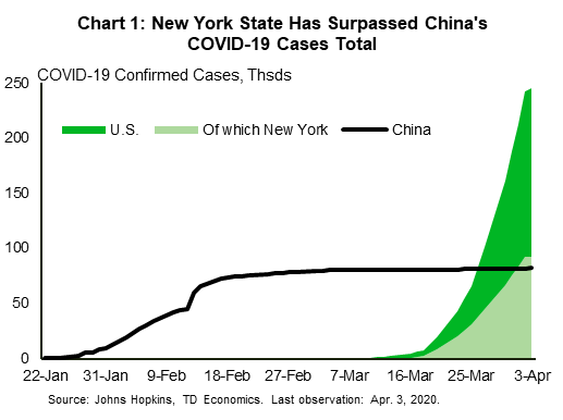 On a global scale, the coronavirus outbreak has yet to show any signs of slowing down. This week saw the largest single-day increase in new confirmed cases with over 80,000 cases added on Thursday. The number of confirmed cases now stands in excess of 1,000,000 worldwide, while fatalities have breached 50,000. On the domestic front, the U.S. continues to see an exponential rise in new cases and has become the global epicenter of the pandemic. The nationwide case count has crossed the 200,000 mark this week, led by a continuous surge in the state of New York which has now surpassed China’s total number of cases (Chart 1).