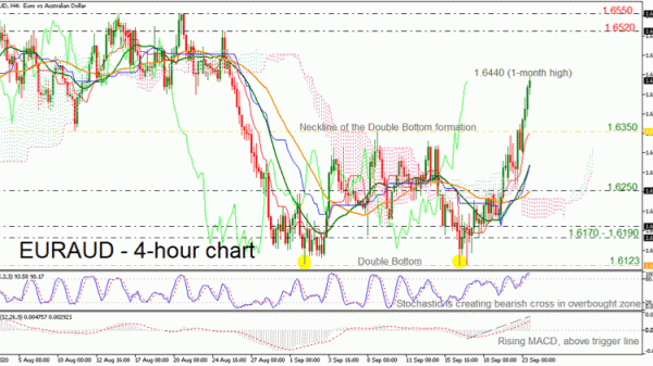 EURAUD spiked to a fresh one-month peak of 1.6440 earlier today. The price completed a double bottom formation after breaching the 1.6350 strong barrier, shifting the bias from bearish to bullish. Meanwhile, the stochastic oscillator is trying to post a bearish crossover in the overbought region, while the rising MACD continues to hold above its trigger and zero lines.
