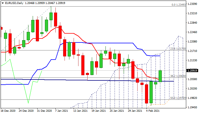 Pivotal 1.21 resistance zone (20DMA / Fibo 38.2% of 1.2349/1.1952) is in focus, with sustained break here to confirm higher low at 1.1955 and expose key barriers at 1.2158 (daily cloud top) and 1.22 zone (Jan 22 lower top / Fibo 61.8%).