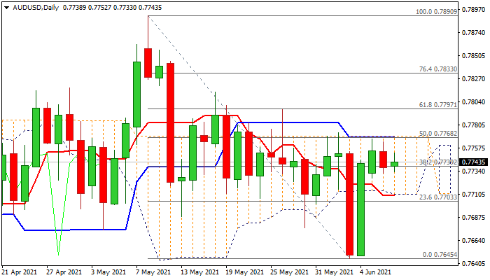 Near-term action is moving within daily cloud (spanned between 0.7710 and 0.7768) with the cloud base being reinforced by daily Tenkan-sen and the upper boundary -cloud top – strengthened by daily Kijun-sen.