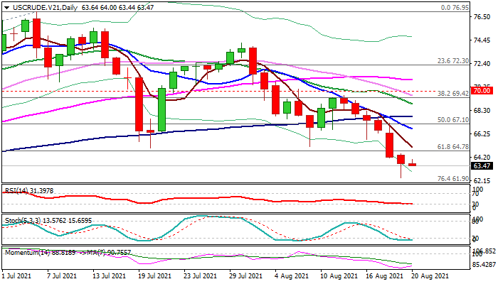 Strong barriers at $64.78 (broken Fibo 61.8%) and $65.02/12 (former double-bottom of July 20/Aug 9) should ideally cap upticks and keep bears intact, but stronger correction cannot be ruled out.