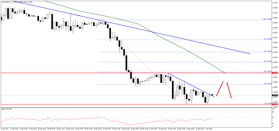 The pair even declined below the 1.1600 zone and settled below the 50 hourly simple moving average. A low is formed near 1.1562 and the pair is now attempting a recovery. It surpassed a short-term bearish trend line with resistance near 1.1576 on the hourly chart.
