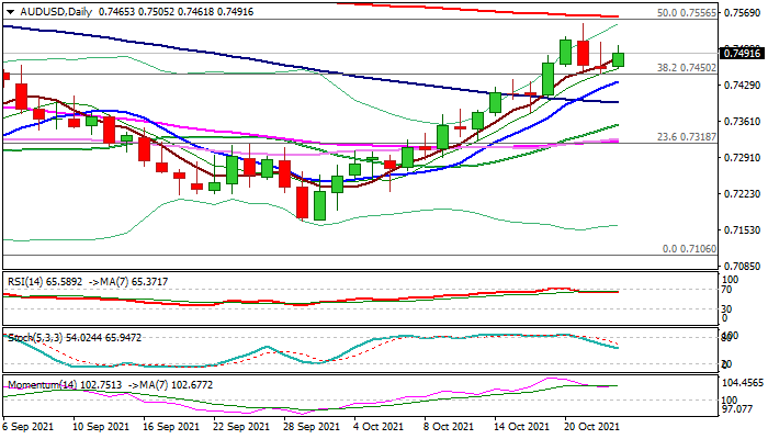 The latest action could be seen as consolidation before eventual attack at 0.7556/60 pivots (50% retracement of 0.8007/0.7106 / 200DMA) break of which is needed to signal bullish continuation.