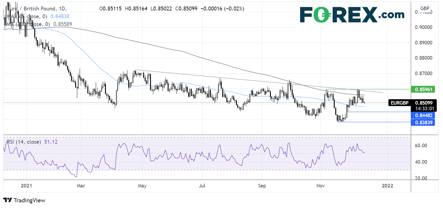 EUR/GBP faced rejection at 0.8595 horizontal resistance, falling trendline resistance and rebounded lower, breaking below the 200 sma but finding support above the 50 sma.