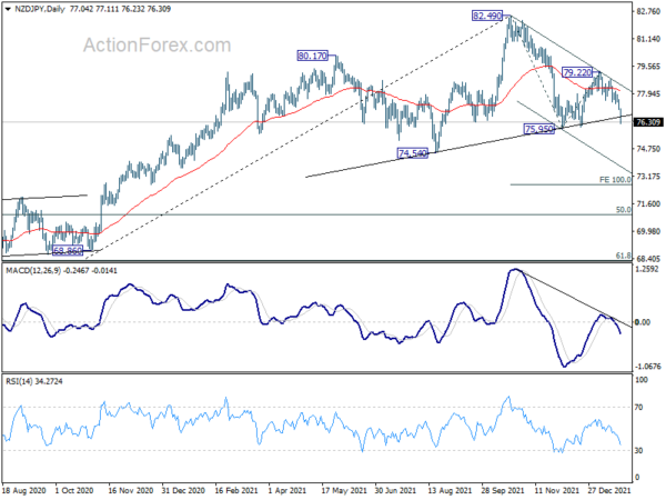 In the currency market, NZD/JPY was the top mover last week, losing -1.90%. The development now confirms that rebound from 75.95 has completed at 79.22. More importantly, fall from 82.49 is ready to resume. Immediate focus is on 75.95 support.